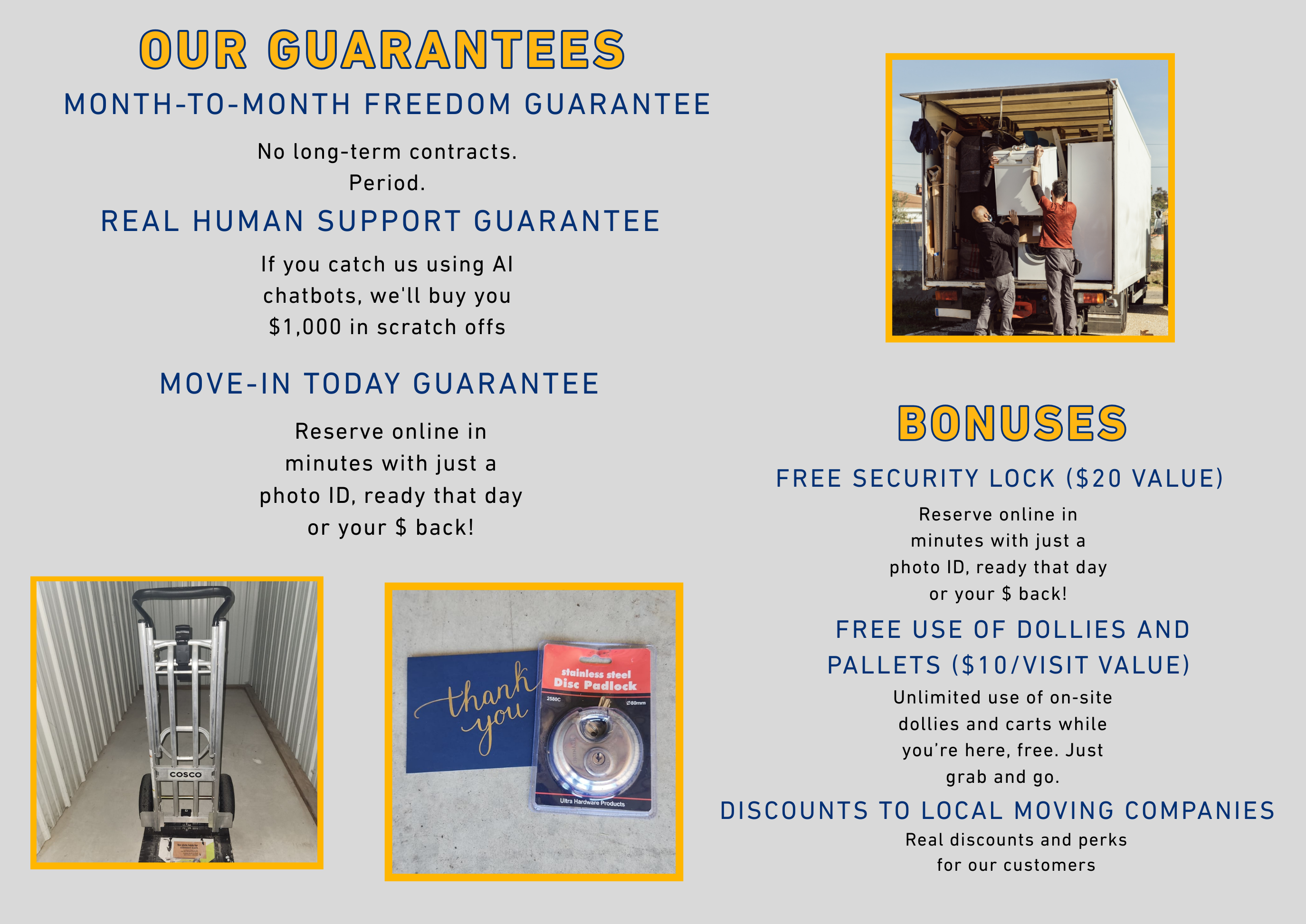 Non-climate-controlled storage with 24/7 drive-up access, same-day move-in, and secure lighting and cameras.